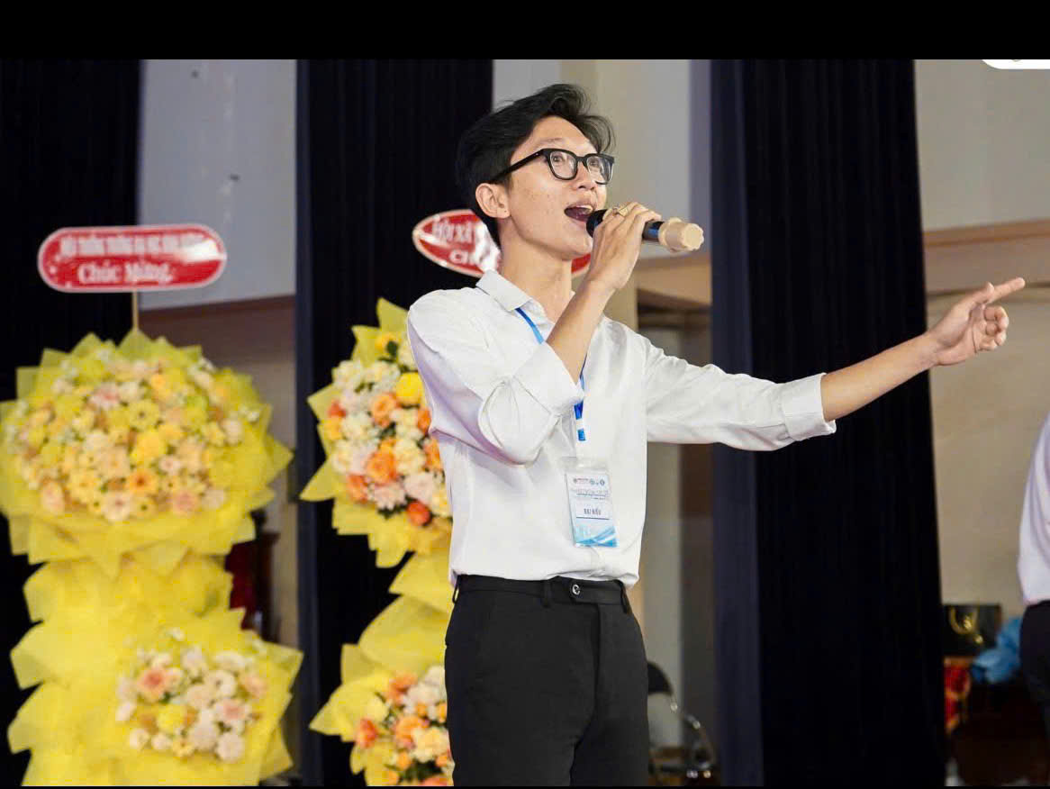 Trần Tấn Phát trong một cuộc thi văn nghệ cấp Trường. Ảnh Trịnh Nam Phong